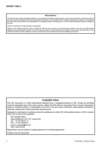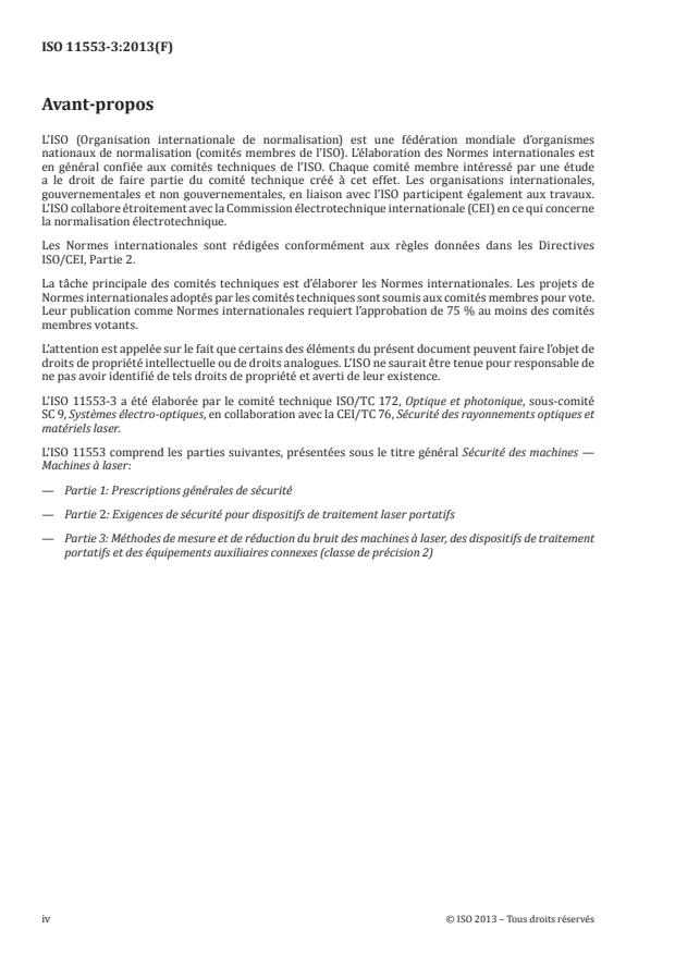 ISO 11553-3:2013 is a standard published by the International Organization for Standardization (ISO). Its full title is "Safety of machinery - Laser processing machines - Part 3: Noise reduction and noise measurement methods for laser processing machines and hand-held processing devices and associated auxiliary equipment (accuracy grade 2)". This standard covers: ISO/IEC 11553-3:2013 describes the requirements to deal with noise hazards and specifies all the information necessary to carry out efficiently and under standardized conditions the determination, declaration and verification of airborne noise emission from laser processing machines and hand-held laser processing devices within the scope of ISO/IEC 11553-1 and ISO/IEC 11553-2. It specifies the safety requirements relating to noise hazards. It specifies noise measurement methods, installation and operating conditions to be used for the test, together with the information to be supplied by manufacturers of such equipment. ISO/IEC 11553-3:2013 applies to those laser processing machines and hand-held laser processing devices included in the scope of ISO/IEC 11553-1 and ISO/IEC 11553-2. Noise emission characteristics include emission sound pressure levels at work stations and the sound power level. Declared noise emission values permit comparison of laser processing machines and hand-held laser processing devices on the market. The use of this noise test code (see Annex A) ensures the reproducibility of the determination of the characteristic noise emission values within specific limits. These limits are determined by the accuracy grade of the noise emission measuring method used. Noise emission measurements specified by ISO/IEC 11553-3:2013 meet the requirements of an engineering method (accuracy grade 2).