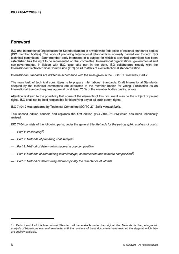 ISO 7404-2:2009 is a standard published by the International Organization for Standardization (ISO). Its full title is "Methods for the petrographic analysis of coals - Part 2: Methods of preparing coal samples". This standard covers: ISO 7404-2:2009 specifies methods for preparing a polished particulate block from a sample of crushed coal for analysis by reflectance microscopy. These methods can also be applied to the preparation of a polished, embedded lump of coal.