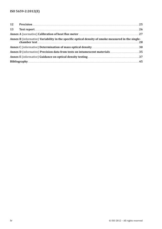 ISO 5659-2:2012 specifies a method of measuring smoke production from the exposed surface of specimens of materials, composites or assemblies. It is applicable to specimens that have an essentially flat surface and do not exceed 25 mm in thickness when placed in a horizontal orientation and subjected to specified levels of thermal irradiance in a closed cabinet with or without the application of a pilot flame. This method of test is applicable to all plastics and may also be used for the evaluation of other materials (e.g. rubbers, textile-coverings, painted surfaces, wood and other materials). It is intended that the values of optical density determined by this test be taken as specific to the specimen or assembly material in the form and thickness tested, and are not to be considered inherent, fundamental properties. The test is intended primarily for use in research and development and fire safety engineering in buildings, trains, ships, etc. and not as a basis for ratings for building codes or other purposes. No basis is provided for predicting the density of smoke that might be generated by the materials upon exposure to heat and flame under other (actual) exposure conditions. This test procedure excludes the effect of irritants on the eye. It is emphasized that smoke production from a material varies according to the irradiance level to which the specimen is exposed. The results yielded from the method specified in this standard are based on exposure to the specific irradiance levels of 25 kW/m2 and 50 kW/m2.