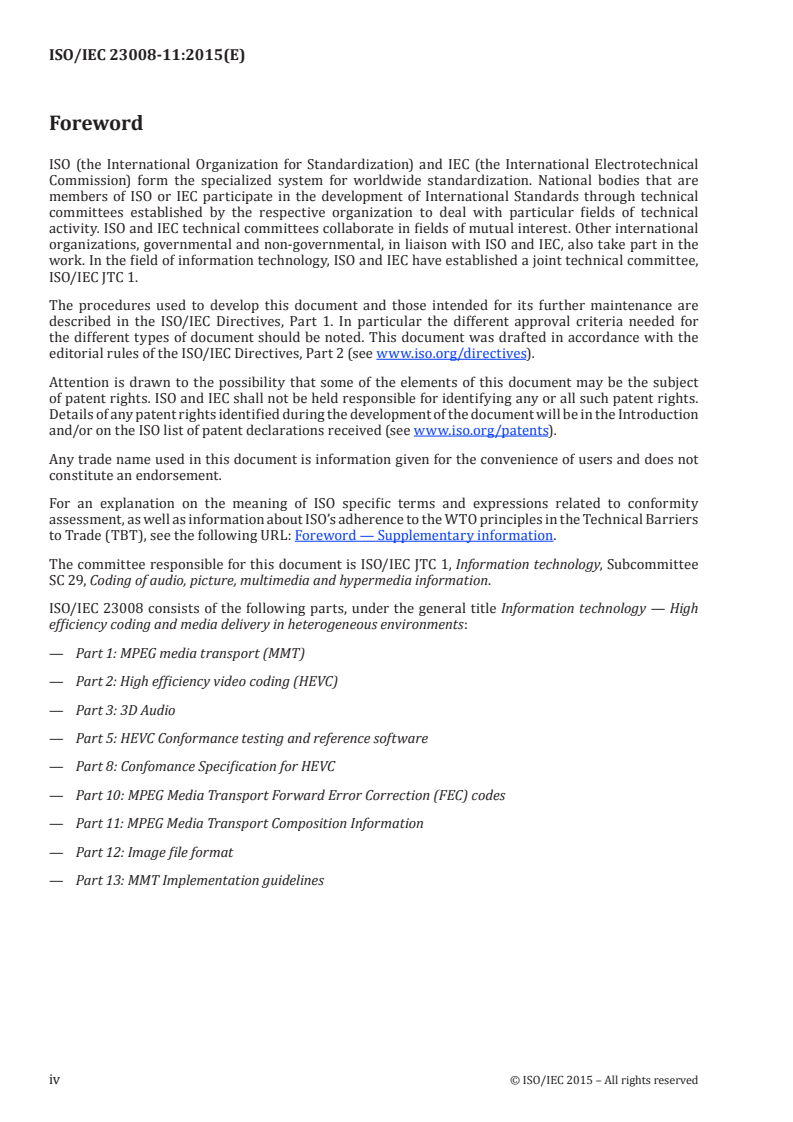 ISO/IEC 23008-11:2015 is a standard published by the International Organization for Standardization (ISO). Its full title is "Information technology — High efficiency coding and media delivery in heterogeneous environments — Part 11: MPEG media transport composition information". This standard covers: ISO/IEC 23008-11:2015 specifies MPEG Composition Information (CI), a method describing composition information of media for delivery of multimedia services over packet-based heterogeneous networks. The technologies for composition function specify the method associating content delivered in the format defined in this part of ISO/IEC 23008 to the presentation and the method representing synchronization between timed and non-timed content.