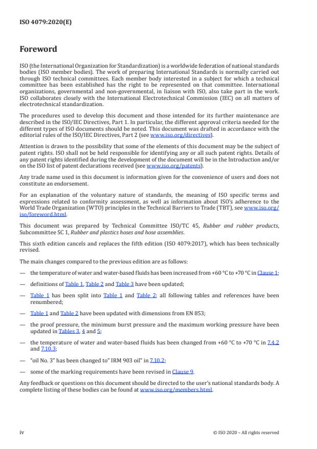 ISO 4079:2020 is a standard published by the International Organization for Standardization (ISO). Its full title is "Rubber hoses and hose assemblies — Textile-reinforced hydraulic types for oil-based or water-based fluids — Specification". This standard covers: This document specifies requirements for five types of textile-reinforced hydraulic hoses and hose assemblies of nominal size from 5 to 100. They are suitable for use with: — oil-based hydraulic fluids HH, HL, HM, HR and HV as defined in ISO 6743‑4 at temperatures ranging from −40 °C to +100 °C; — water-based fluids HFC, HFAE, HFAS and HFB as defined in ISO 6743‑4 at temperatures ranging from −40 °C to +70 °C; — water at temperatures ranging from 0 °C to +70 °C. This document does not include requirements for end fittings. It is limited to requirements for hoses and hose assemblies. NOTE It is the responsibility of the user, in consultation with the hose manufacturer, to establish the compatibility of the hose with the fluid to be used.