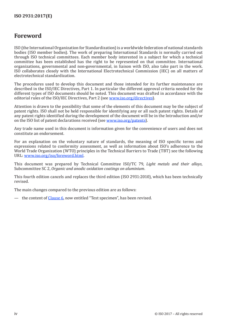 ISO 2931:2017 is a standard published by the International Organization for Standardization (ISO). Its full title is "Anodizing of aluminium and its alloys - Assessment of quality of sealed anodic oxidation coatings by measurement of admittance". This standard covers: ISO 2931:2017 specifies a method for assessing the quality of sealed anodic oxidation coatings on aluminium and its alloys by measurement of the admittance. The method is applicable to anodic oxidation coatings sealed in an aqueous medium. NOTE 1 Results obtained from anodic oxidation coatings sealed by different methods, e.g. hydrothermal sealing and cold sealing, are not necessarily comparable. NOTE 2 Results obtained from anodic oxidation coatings on alloys containing more than 2 % silicon or 5 % manganese or 3 % magnesium are not comparable with results obtained from anodic oxidation coatings on more dilute alloys. The method is suitable for use as a production-control test and as an acceptance test where there is agreement between the anodizer and the customer. Any type of anodized component can be tested by the method described, provided that there is a sufficient area (a circle of diameter about 20 mm) and that the film thickness is greater than 3 µm.