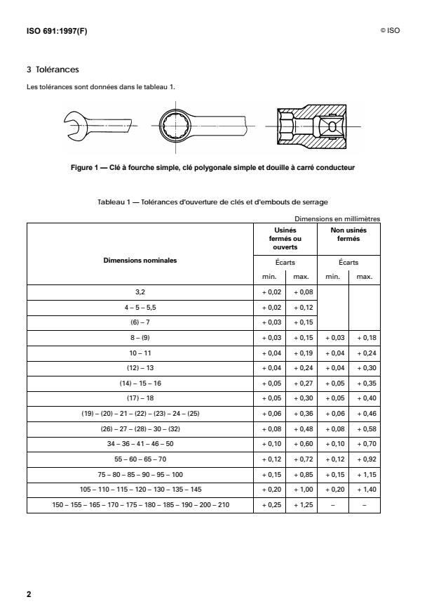 ISO 691:1997 - Outils de manoeuvre pour vis et écrous -- Ouvertures de clés et d'embouts de serrage -- Tolérances d'usage courant