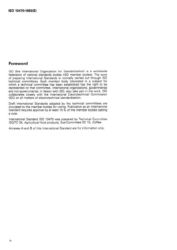 ISO 10470:1993 is a standard published by the International Organization for Standardization (ISO). Its full title is "Green coffee — Defect reference chart". This standard covers: Gives a listing in chart form of the main types of defect. Each of the following main types of commercial green coffee is considered separately: wet-processed Arabica, dry-processed Arabica, dry-processed Robusta. The chart gives definitions and characteristics of each defect, together with its likely cause, and its effect on roasting and on brew flavour of the roasted bean. A qualitative assessment of the effects of the defects on appearance and flavour is also given in terms of their generally accepted significance.