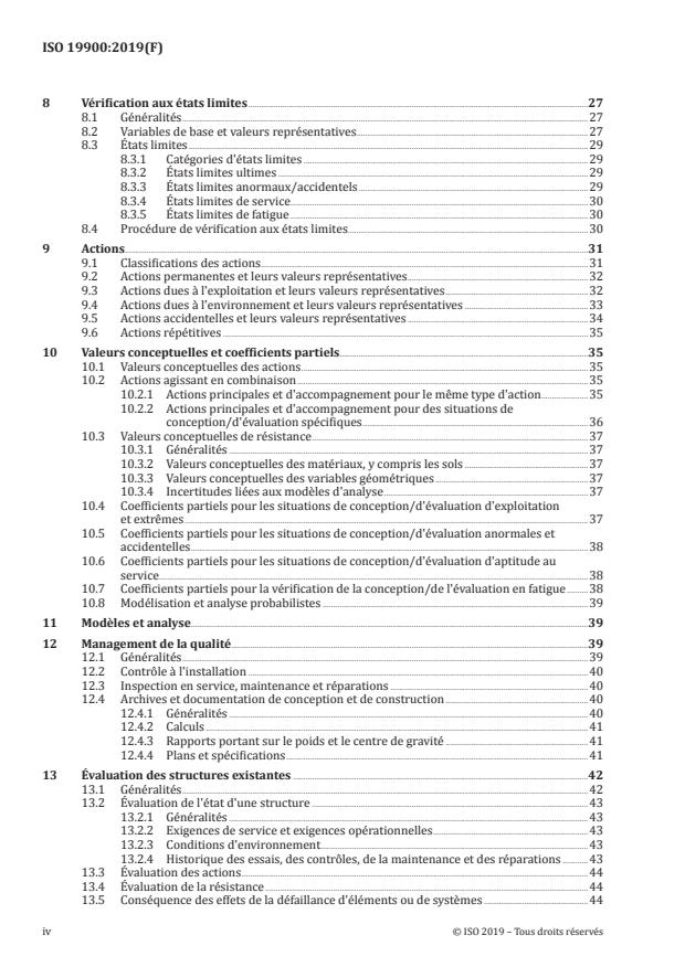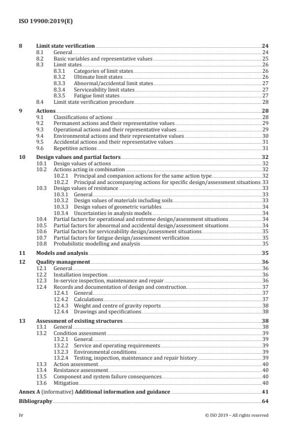 ISO 19900 is a general requirements document intended to be used with more specialized standards and normative references covering specific design methods, materials, fatigue, geotechnical guidance and platform systems. When applying ISO 19900:2019, consult applicable ISO and industry standards for detailed calculations, material properties and system‑specific rules.
