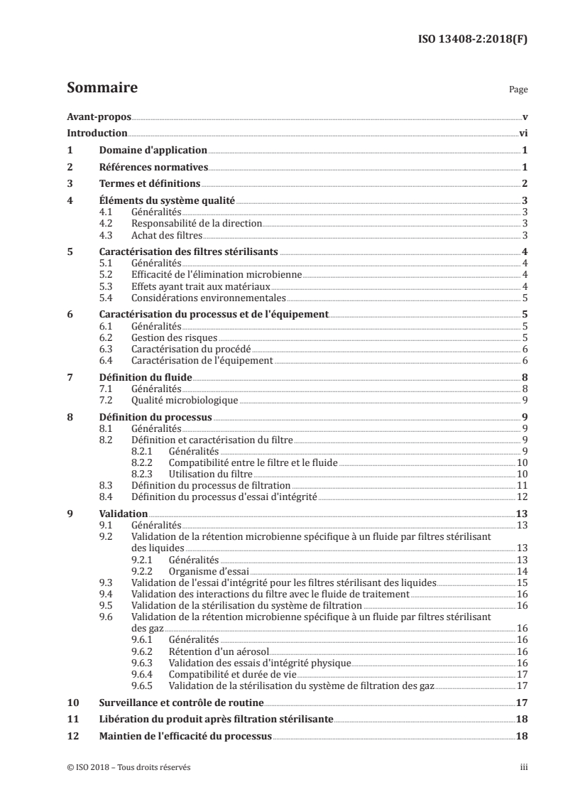 ISO 13408-2:2018 spécifie les exigences de filtration stérilisante dans le cadre du traitement aseptique des produits de santé, mené conformément à ISO 13408‑1. Il propose également aux utilisateurs de filtres des recommandations concernant les exigences générales pour la configuration, la validation et les opérations de routine d'un processus de filtration stérilisante. ISO 13408-2:2018 ne concerne pas l'élimination des virus. La filtration stérilisante ne s'applique pas aux fluides contenant volontairement des particules de taille supérieure à la dimension des pores du filtre (par exemple: vaccins à cellules bactériennes entières). ISO 13408-2:2018 ne s'applique pas aux filtres HEPA (High Efficiency Particulate Air). ISO 13408-2:2018 ne spécifie pas d'exigences relatives à l'élaboration, à la validation et au contrôle de routine d'un processus d'élimination des agents de prolifération de l'encéphalopathie spongiforme, telle que la tremblante du mouton, l'encéphalopathie spongiforme bovine et la maladie de Creutzfeldt-Jakob. Des recommandations spécifiques ont été rédigées dans des pays déterminés pour le traitement des matériaux potentiellement contaminés par ces agents.