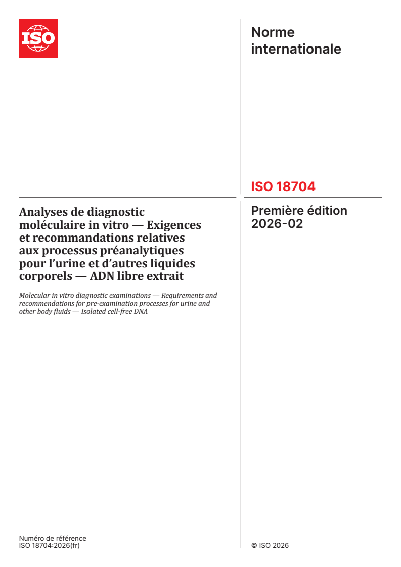ISO 18704:2026 - Analyses de diagnostic moléculaire in vitro — Exigences et recommandations relatives aux processus préanalytiques pour l’urine et d’autres liquides corporels — ADN libre extrait Released:3. 02. 2026