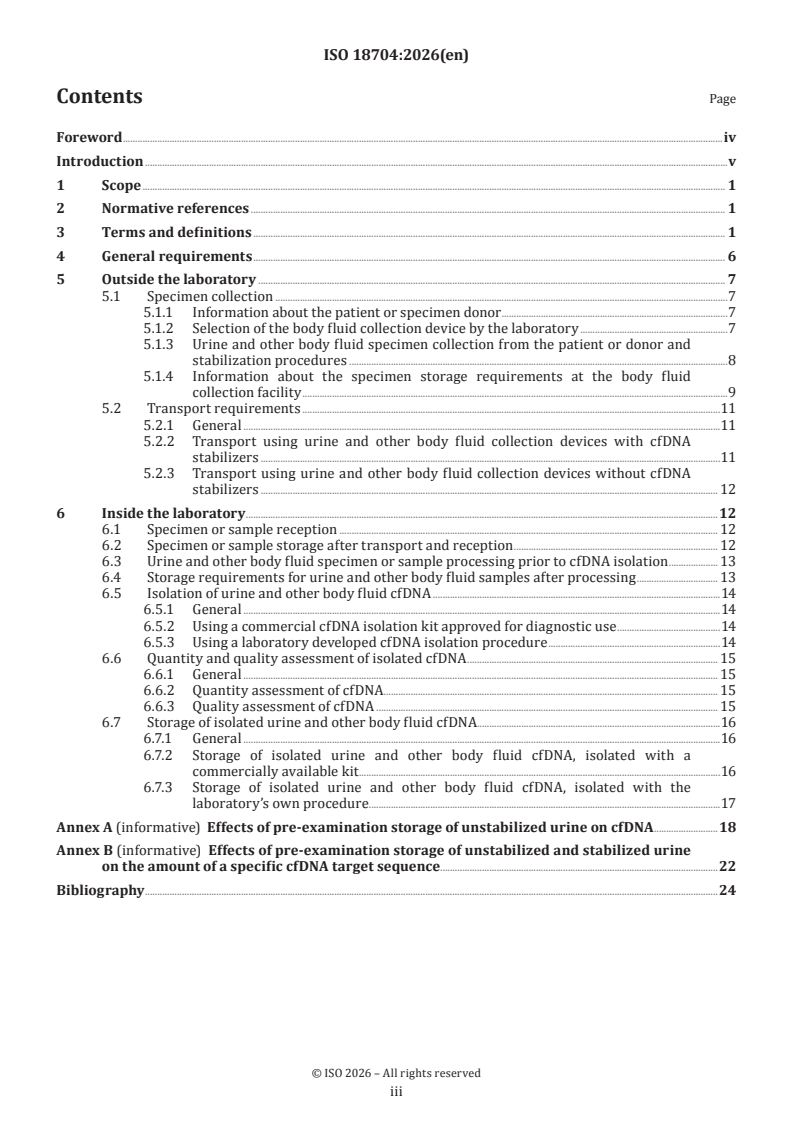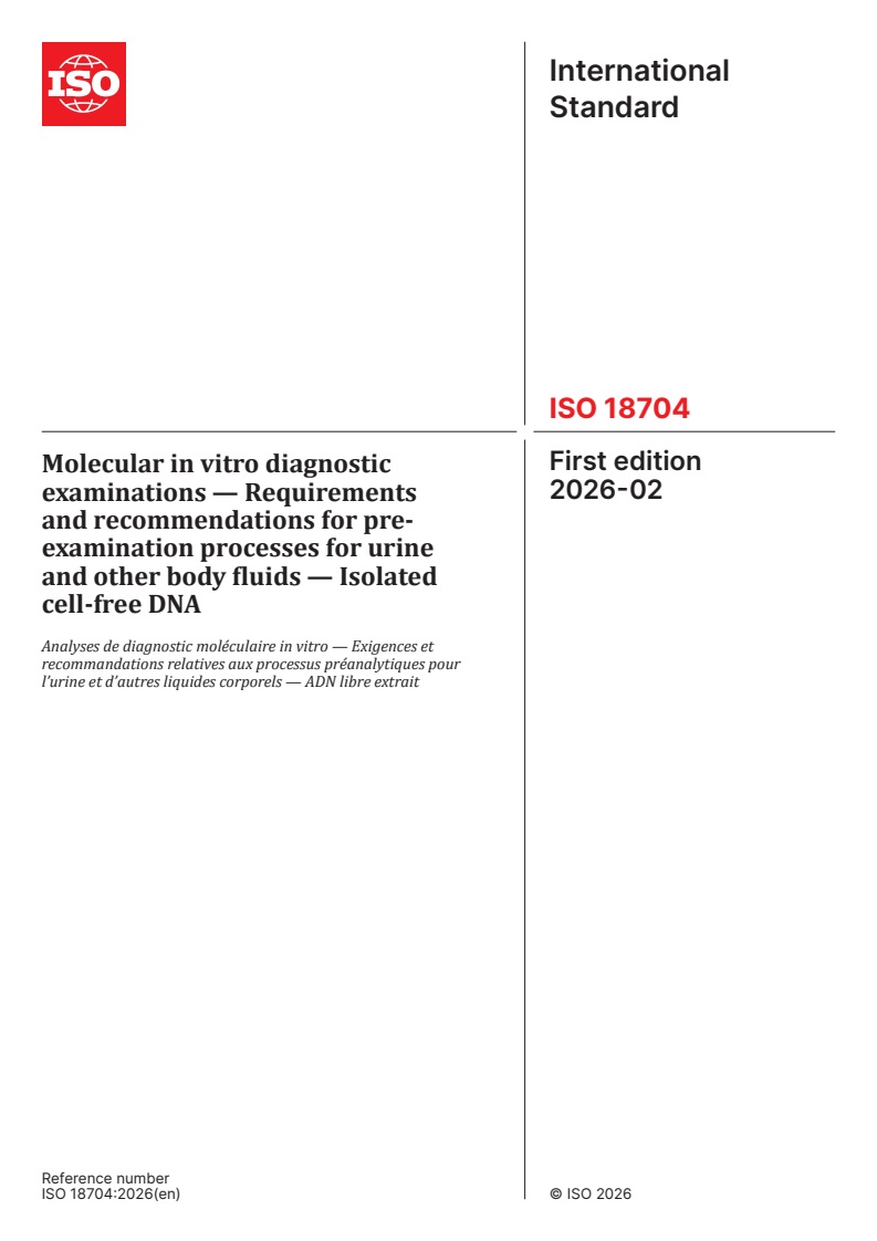 ISO 18704:2026 - Molecular in vitro diagnostic examinations — Requirements and recommendations for pre-examination processes for urine and other body fluids — Isolated cell-free DNA Released:3. 02. 2026