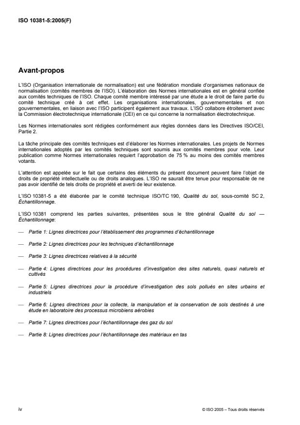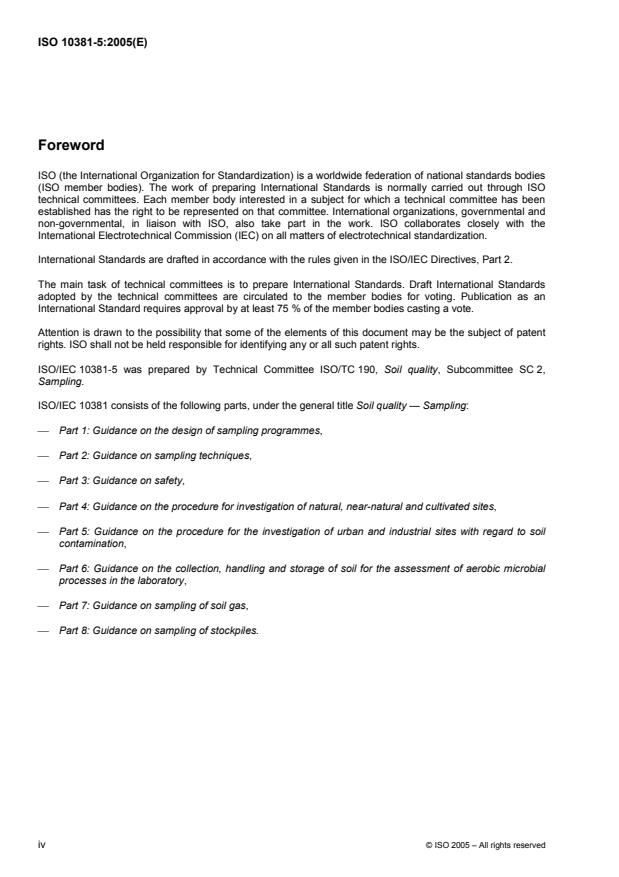 L'ISO 10381-5:2005 donne des lignes directrices pour la procédure d'investigation de sites urbains et industriels sur lesquels une pollution est avérée ou suspectée. L'ISO 10381-5:2005 s'applique également lorsqu'il est nécessaire de définir l'état de pollution du site ou d'évaluer la qualité environnementale du site à d'autres fins. L'ISO 10381-5:2005 comporte des lignes directrices sur la collecte des informations nécessaires à l'évaluation des risques et/ou à l'élaboration de plans d'actions correctives (par exemple nécessité éventuelle d'une dépollution et suggestions relatives à la meilleure méthode pour y parvenir). Toutefois, elle ne fournit des indications que sur les informations nécessaires au plan général. Il est à noter que certaines méthodes de dépollution spécifiques peuvent nécessiter l'obtention d'informations supplémentaires. L'ISO 10381-5:2005 est également applicable aux sites sur lesquels aucune pollution du sol n'est suspectée, mais pour lesquels la qualité du sol doit être déterminée (par exemple pour vérifier l'absence de toute pollution).