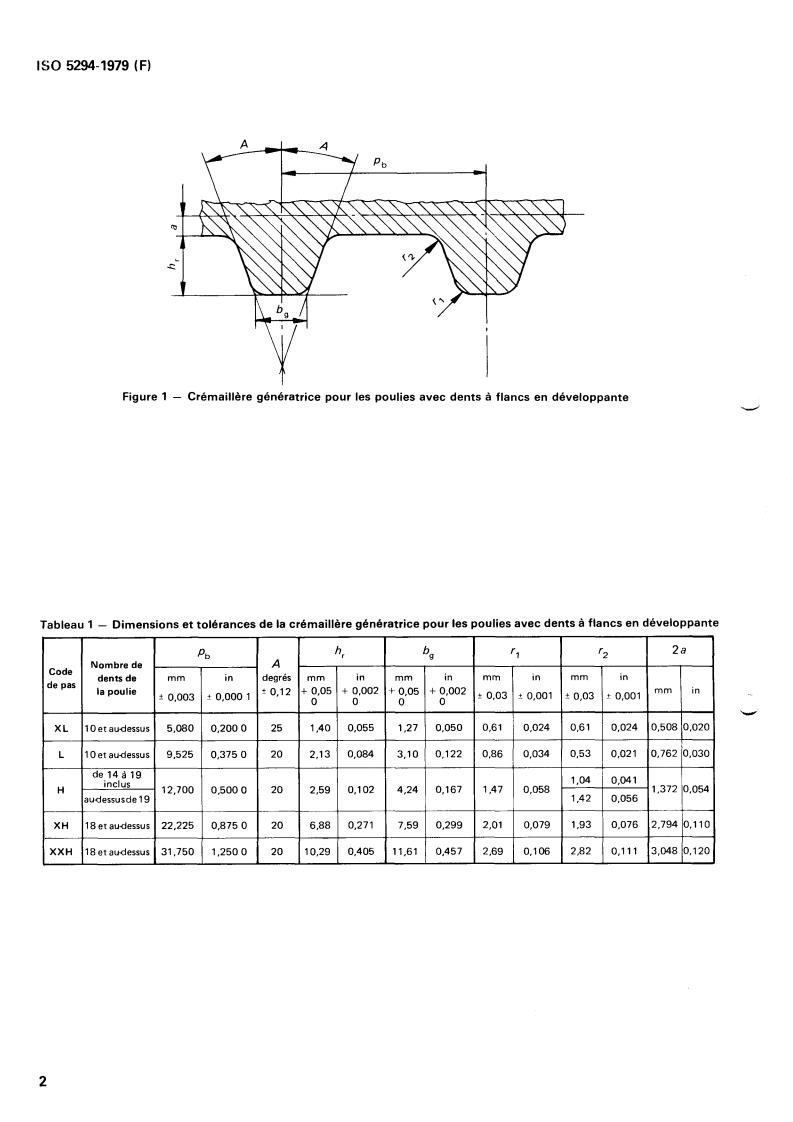 Tableau 2 - Dimensions et tolérances pour les poulies avec dents à flancs droits