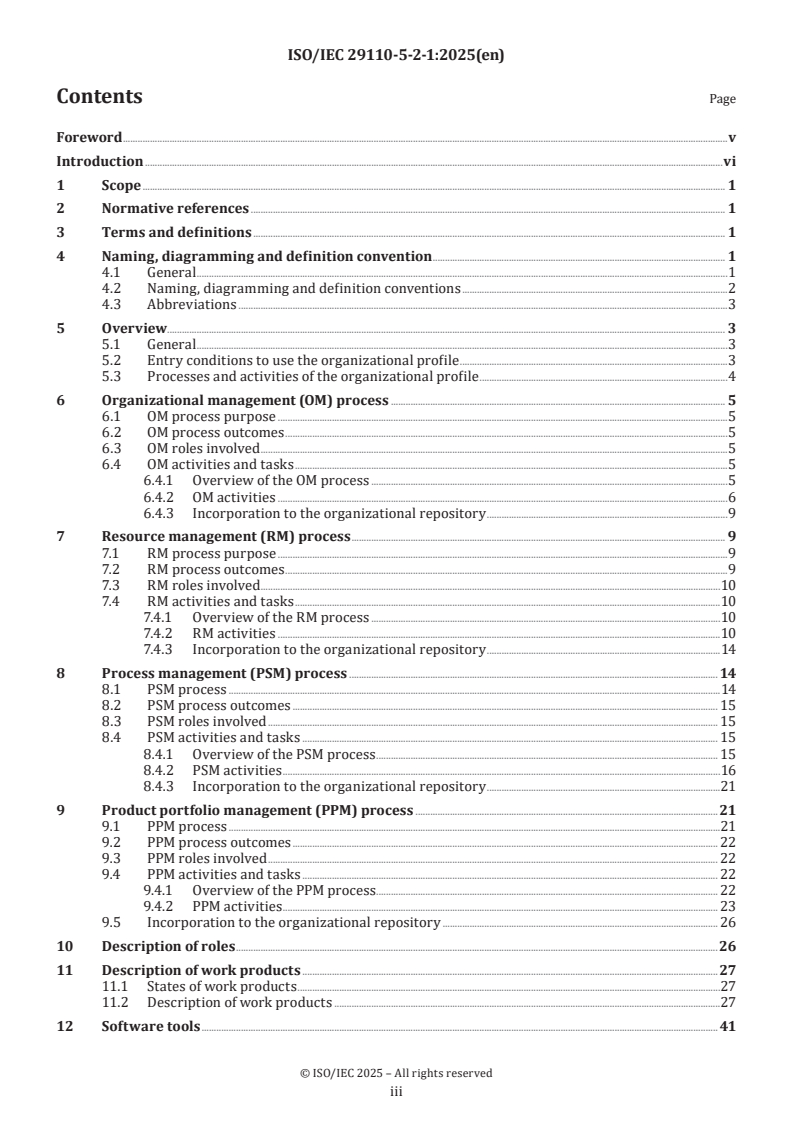 ISO/IEC 29110-5-2-1:2025 - Systems and software engineering - Life cycle profiles for very small entities (VSEs) - Part 5-2-1: Organizational management guidelines provides practical management guidance for VSEs (organizations of up to 25 people) that develop software or operate through defined processes. It complements the organizational profile in ISO/IEC 29110-4-2 by detailing management activities for organizational management, product portfolio management, resource management and process management. The document is the first edition (2025) and is intended to help VSEs improve customer satisfaction and productivity using lightweight, fit‑for‑purpose practices.