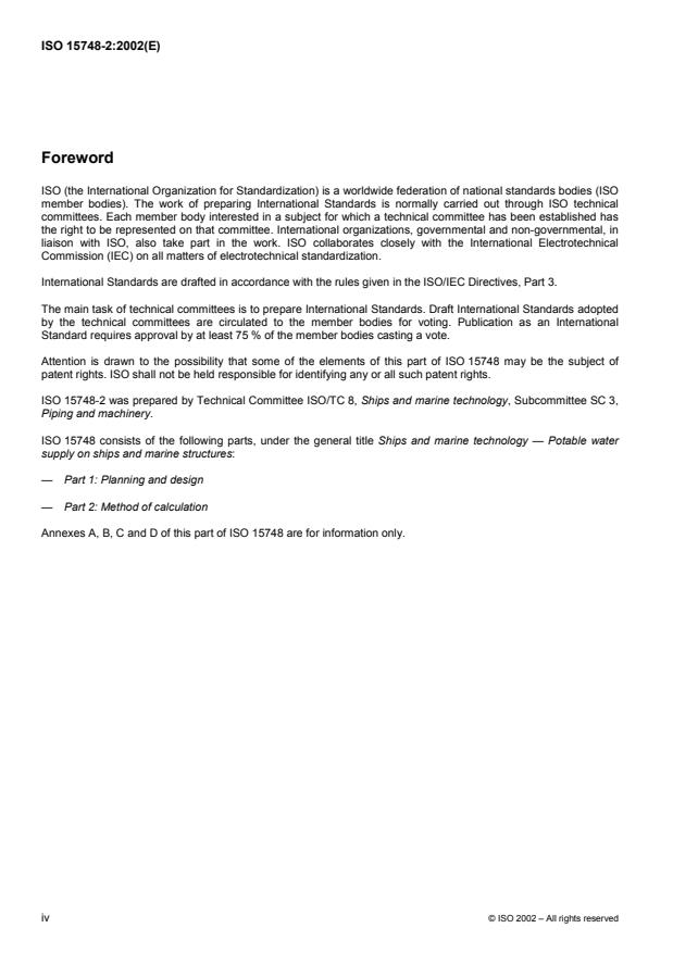 ISO 15748-2:2002 is a standard published by the International Organization for Standardization (ISO). Its full title is "Ships and marine technology — Potable water supply on ships and marine structures — Part 2: Method of calculation". This standard covers: ISO 15748-2 applies to the planning, design and configuration of potable water supply systems on ships, stationary or floating marine structures and inland waterway crafts. It serves to determine the quantity of potable water to be carried on board, the capacity of the pressurized reservoirs and water heaters, the pumping capacity, etc.