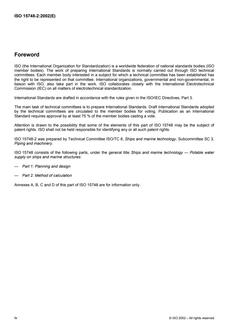 ISO 15748-2:2002 is a standard published by the International Organization for Standardization (ISO). Its full title is "Ships and marine technology - Potable water supply on ships and marine structures - Part 2: Method of calculation". This standard covers: ISO 15748-2 applies to the planning, design and configuration of potable water supply systems on ships, stationary or floating marine structures and inland waterway crafts. It serves to determine the quantity of potable water to be carried on board, the capacity of the pressurized reservoirs and water heaters, the pumping capacity, etc.