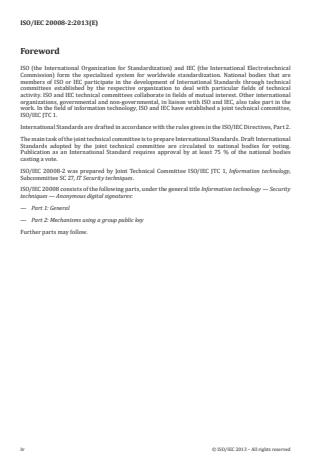 ISO/IEC 20008-2:2013 is a standard published by the International Organization for Standardization (ISO). Its full title is "Information technology - Security techniques - Anonymous digital signatures - Part 2: Mechanisms using a group public key". This standard covers: ISO/IEC 20008-2:2013 specifies anonymous digital signature mechanisms, in which a verifier makes use of a group public key to verify a digital signature. It provides a general description of an anonymous digital signature mechanism using a group public key; a variety of mechanisms that provide such anonymous digital signatures. For each mechanism, ISO/IEC 20008-2:2013 specifies the process for generating group member signature keys and a group public key; the process for producing signatures; the process for verifying signatures; the process for opening signatures (if the mechanism supports opening); the process for linking signatures (if the mechanism supports linking); the process for revoking group members.