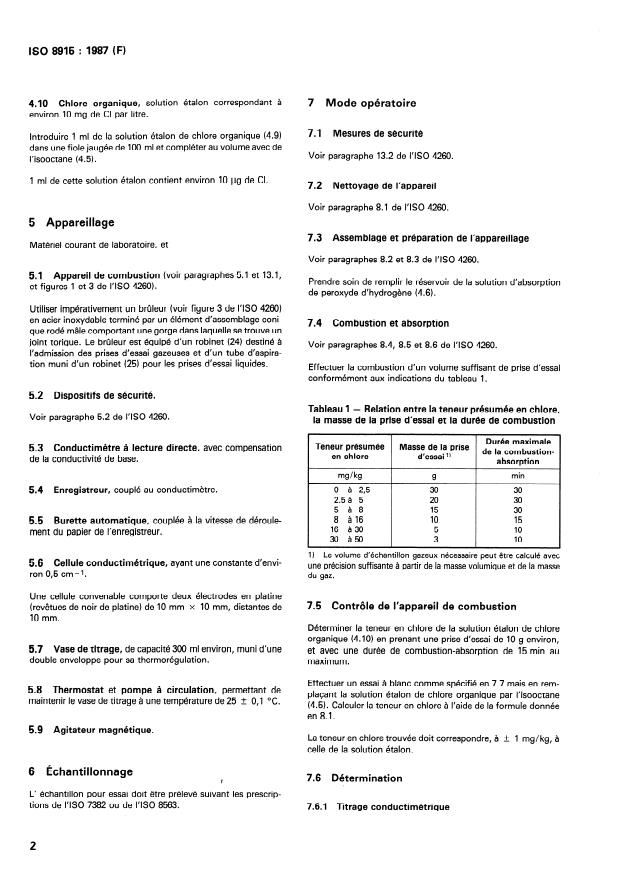 ISO 8915:1987 - Oléfines légeres a usage industriel -- Dosage des traces de chlore -- Méthode de combustion Wickbold