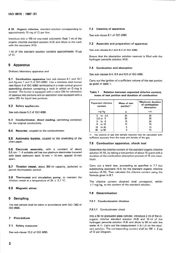 ISO 8915:1987 is a standard published by the International Organization for Standardization (ISO). Its full title is "Light olefins for industrial use — Determination of traces of chlorine — Wickbold combustion method". This standard covers: A gaseous or liquid test portion is aspirated into the oxygen-hydrogen flame of a burner where it is burned with considerable excess of oxygen. the liberated chlorine and hydrochloric acid are absorbed in hydrogen peroxide solution. The chloride ions are conductimetrically or potentiometrically titrated with a silver nitrate solution.