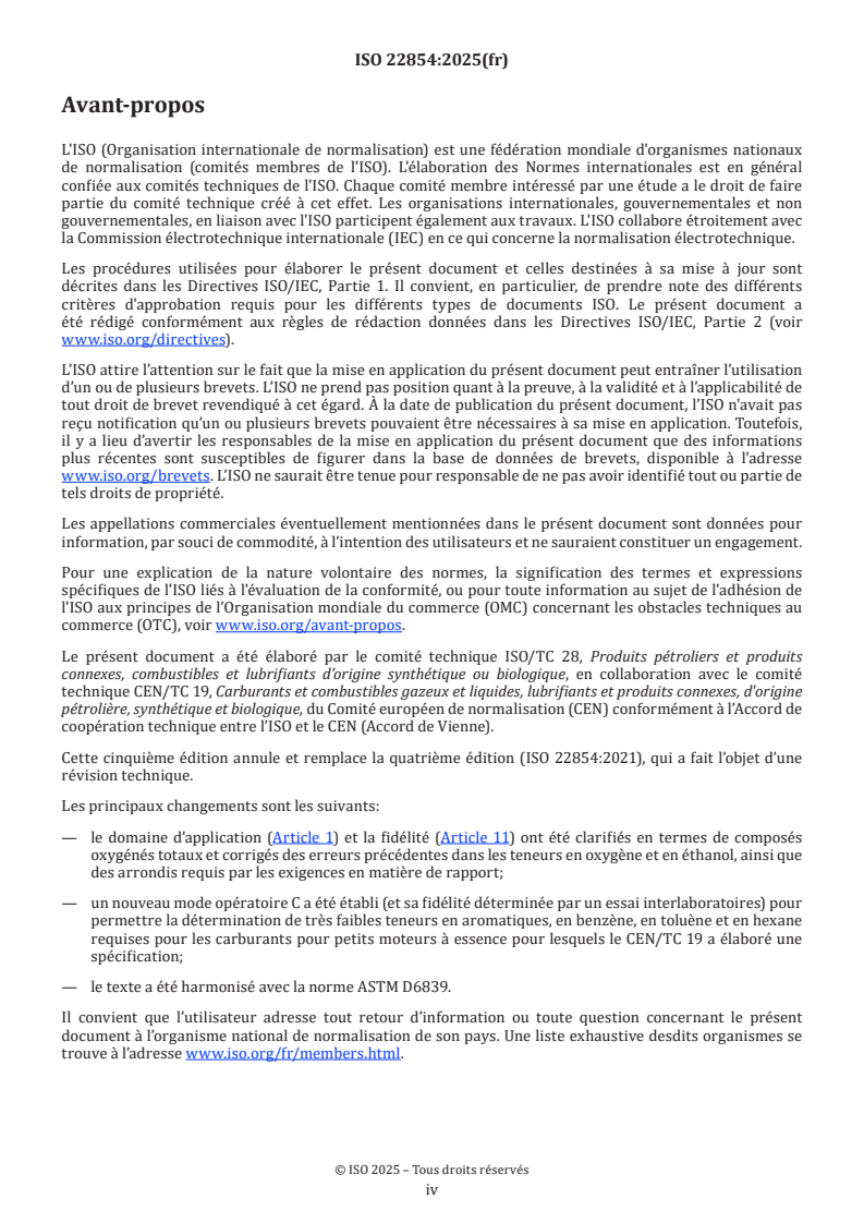 ISO 22854:2025 - “Liquid petroleum products - Determination of hydrocarbon types and oxygenates in automotive‑motor gasoline and in ethanol (E85) automotive fuel - Multidimensional gas chromatography method” - specifies a multidimensional gas chromatography (GC) test method to quantify saturates, olefins, aromatics, benzene, toluene, a range of oxygenated compounds, and total oxygen content in automotive motor gasoline, small‑engine petrol and ethanol (E85) automotive fuel. Although developed for oxygenated motor gasoline, the method also applies to hydrocarbon streams with similar boiling ranges (e.g., naphthas, reformates). The fifth edition updates procedure options, precision data and harmonization with related methods.