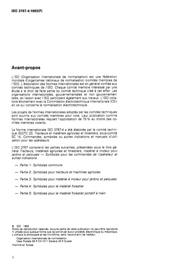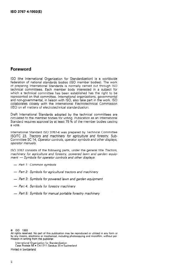 ISO 3767-4:1993 is a standard published by the International Organization for Standardization (ISO). Its full title is "Tractors, machinery for agriculture and forestry, powered lawn and garden equipment — Symbols for operator controls and other displays — Part 4: Symbols for forestry machinery". This standard covers: Establishes 113 graphical symbols uniquely for use on operator controls and other displays on specialized forestry machinery as defined in ISO 6814, such as log loaders. Also included are symbols for controls and displays specific to equipment such as saws, stabilizers and winches.