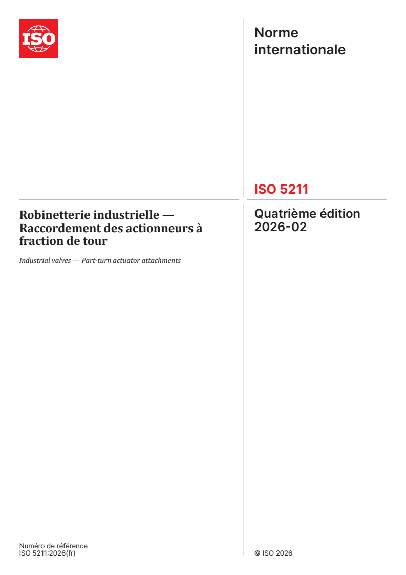 ISO 5211:2026 - Robinetterie industrielle — Raccordement des actionneurs à fraction de tour Released:2/12/2026