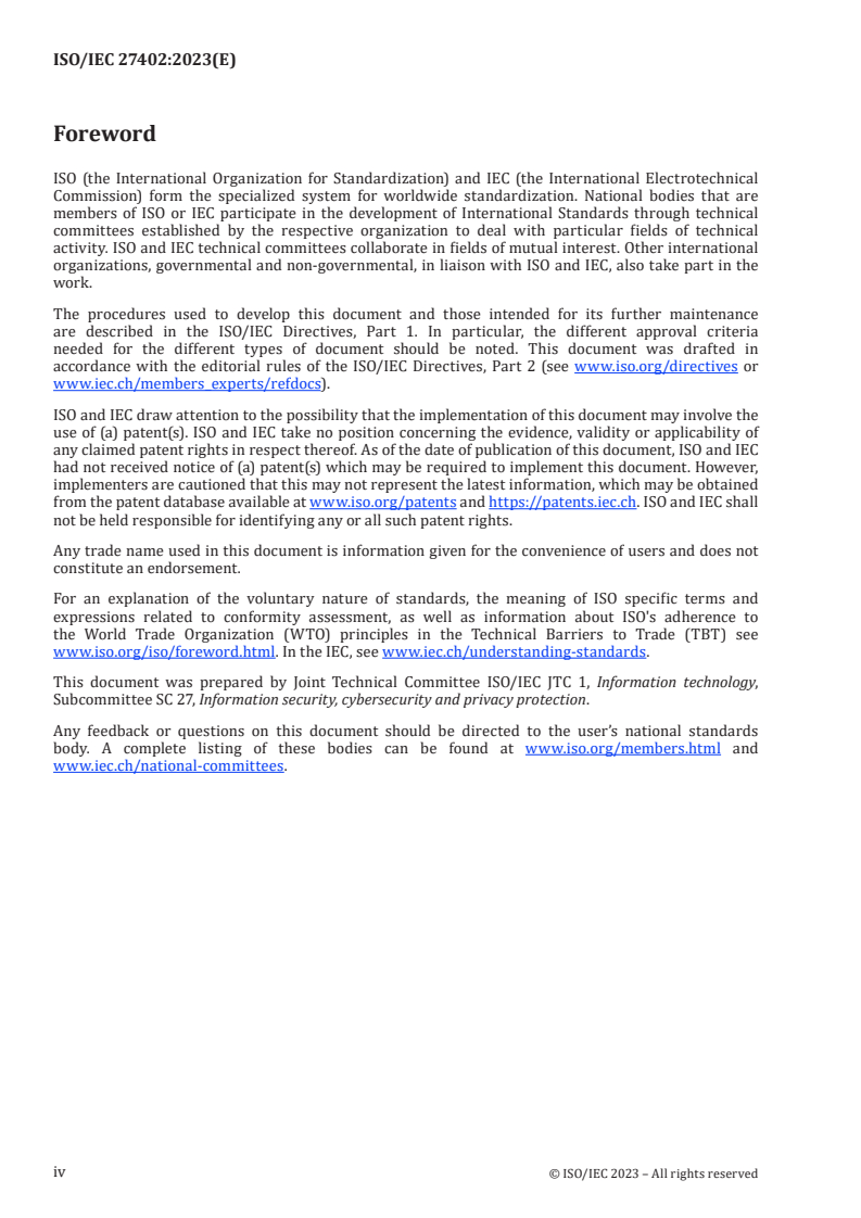 ISO/IEC 27402:2023 is a standard published by the International Organization for Standardization (ISO). Its full title is "Cybersecurity - IoT security and privacy - Device baseline requirements". This standard covers: This document provides baseline ICT requirements for IoT devices to support security and privacy controls.