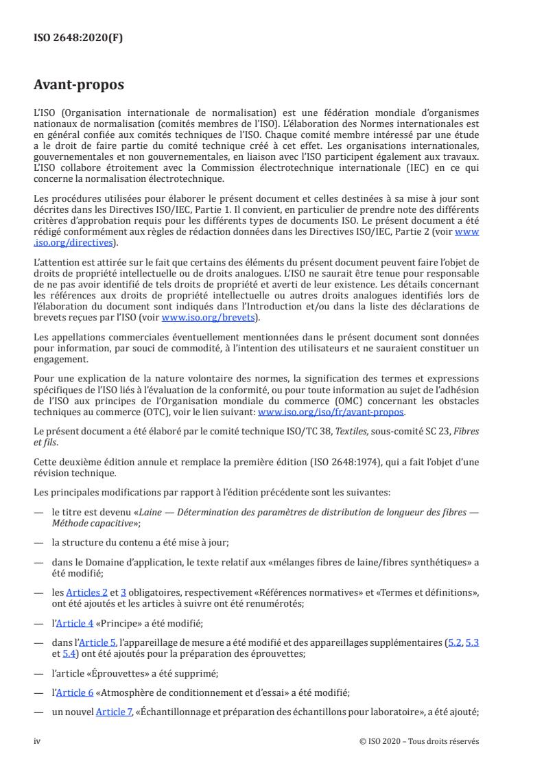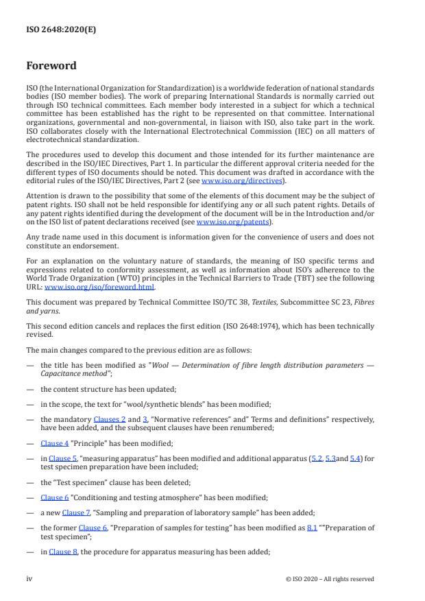 ISO 2648:2020 is a standard published by the International Organization for Standardization (ISO). Its full title is "Wool — Determination of fibre length distribution parameters — Capacitance method". This standard covers: This document specifies a method for the determination of fibre length distribution parameters (principally mean length, expressed as Hauteur or Barbe, and the coefficient of variation of the measurement) on slivers and rovings made from combed wool or combed synthetic fibres. As the fibres of different chemical structure have different di-electric values, the method is not directly applicable to slivers made up of a blend of wool/synthetic fibres.