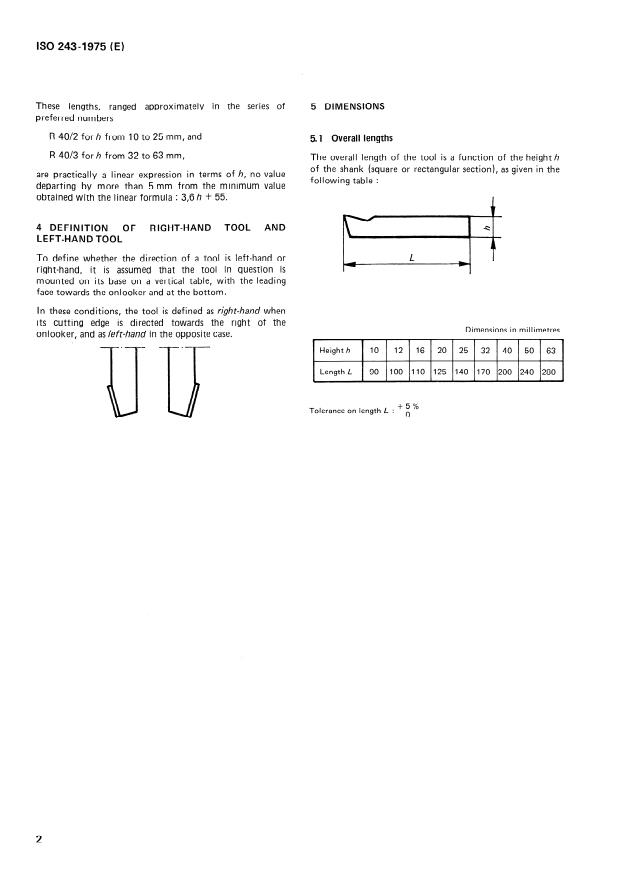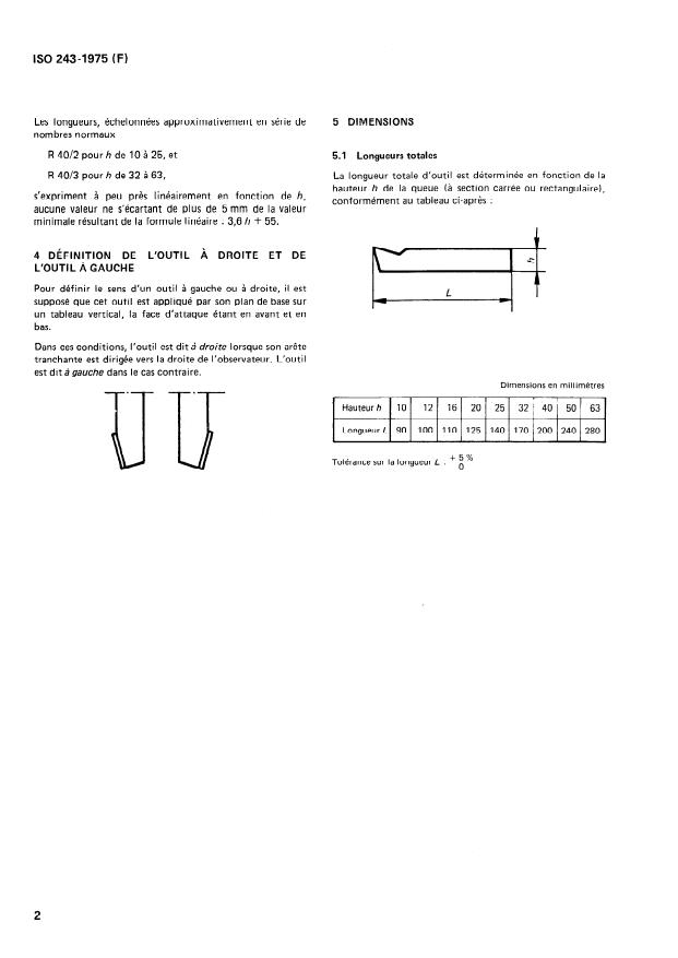 ISO 243:1975 is a standard published by the International Organization for Standardization (ISO). Its full title is "Turning tools with carbide tips — External tools". This standard covers: La présente Norme Internationale spécifie les formes et fixe les dimensions des outils de tour à plaquettes en carbures métalliques, outils d'extérieur. Elle donne également la définition des outils à droite ou à gauche. Les outils d'intérieur font l'objet de l'ISO 514; la désignation et le marquage, de l'ISO 504. Les sections de queues et les plaquettes utilisées sont choisies respectivement parmi celles faisant l'objet de l'ISO 241 et de l'ISO 242.