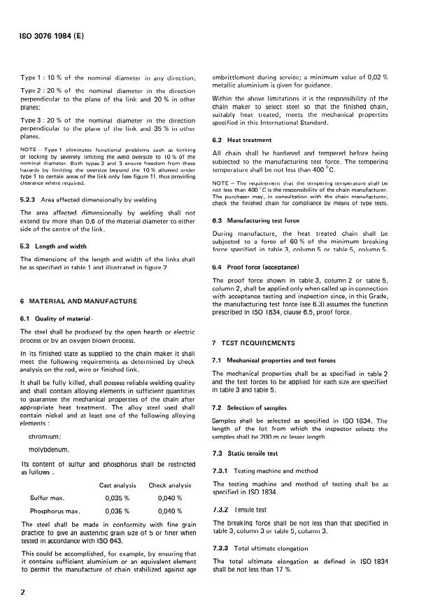 ISO 3076:1984 is a standard published by the International Organization for Standardization (ISO). Its full title is "Short link chain for lifting purposes — Grade T (8), non-calibrated, for chain slings etc.". This standard covers: This second edition, which cancels and replaces ISO 3077:1980, incorporates draft Amendment 1. Specifies the requirements for lifting chains, grade T (8), non-calibrated, for use on cranes, in chain slings and for general lifting purposes. These are electrically welded round steel short link chains, fully heat treated and tested complying with ISO 1834. The range of sizes covered is from 5 to 45 mm. The annex gives a range of temporary additional sizes 6 to 35 mm.
