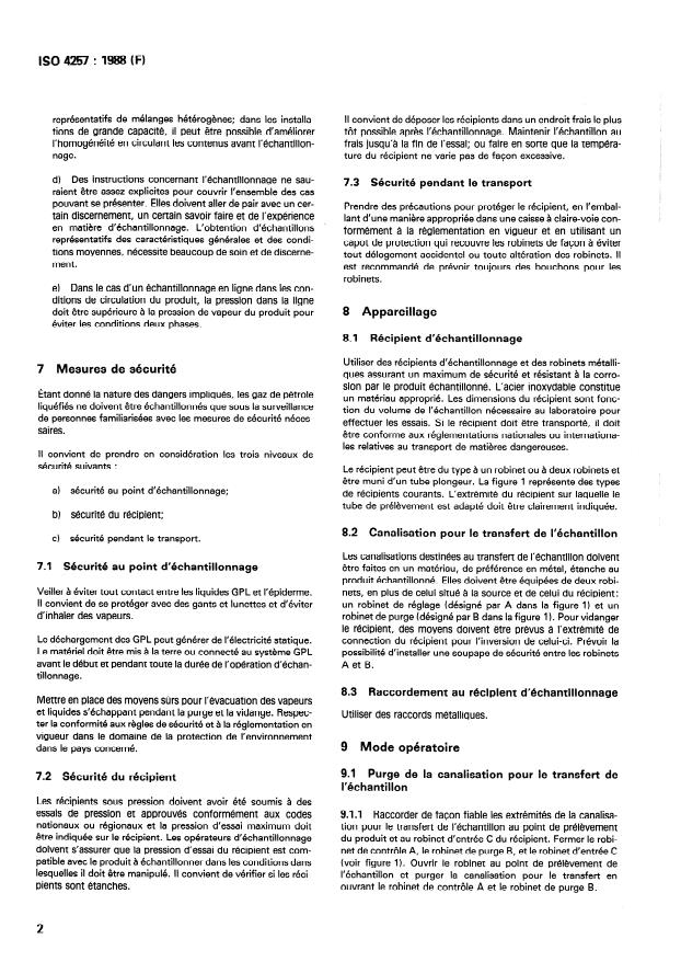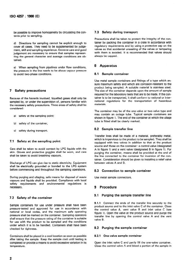 ISO 4257:1988 is a standard published by the International Organization for Standardization (ISO). Its full title is "Liquefied petroleum gases — Method of sampling". This standard covers: Procedure given applies to gases, such as propane, butane or mixtures thereof. It is suitable for sampling into containers to provide samples for laboratory testing of products covered by ISO 9162. Although this procedures can be used to provide samples for compositional analysis, it is strongly recommended that alternative apparatus, such as a variable-volume container, be used to minimize compositional changes that may occur.