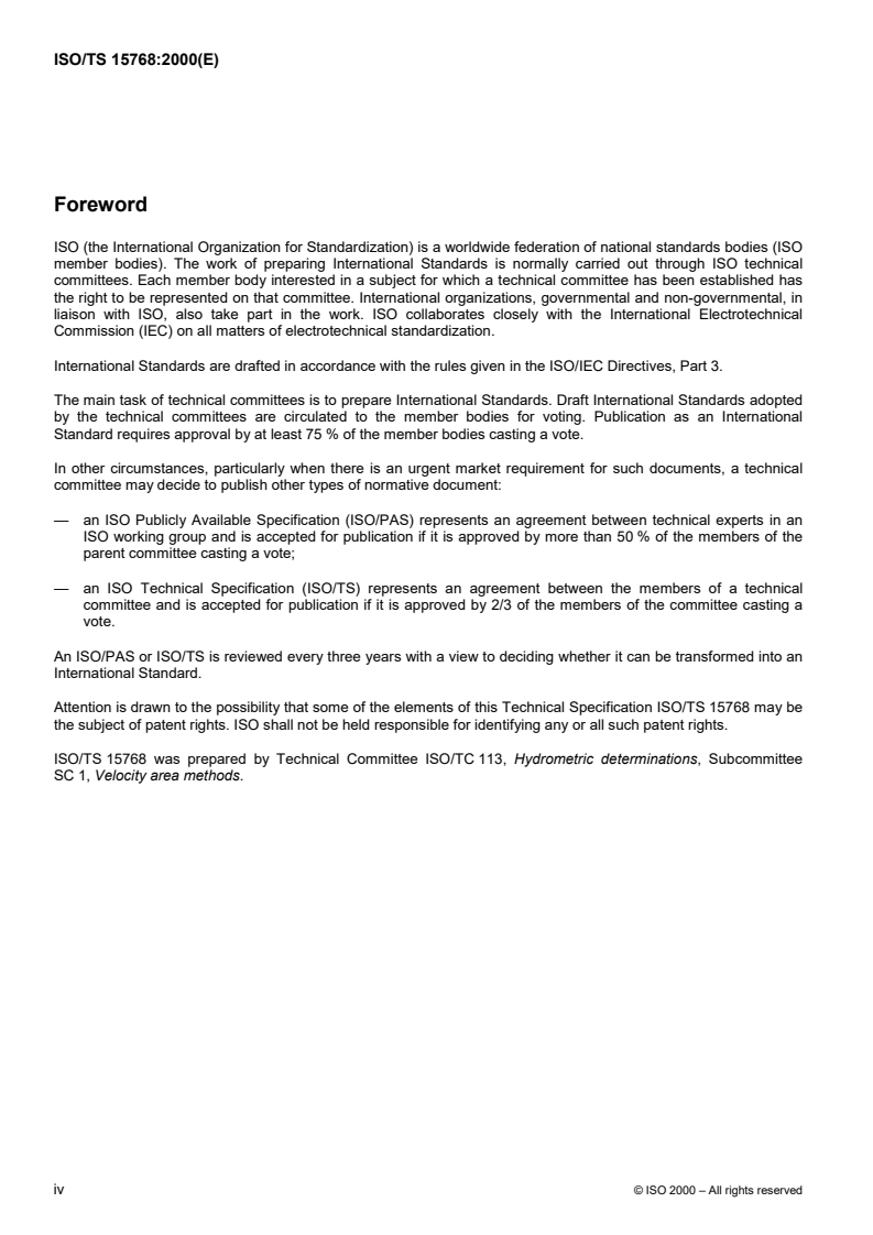 ISO/TS 15768:2000 is a technical specification published by the International Organization for Standardization (ISO). Its full title is "Measurement of liquid velocity in open channels - Design, selection and use of electromagnetic current meters". This standard covers: This Technical Specification gives guidelines for the design, selection and use of electromagnetic current meters used to determine point velocity for the purpose of measuring flow in an open channel using the velocity area method. NOTE The electromagnetic current meter is acceptable as a device for making point determinations of velocity for the purposes of open channel flow determination by the velocity area method, using the multiple point velocity sampling technique described in ISO 748 (see reference [1] in the Bibliography).