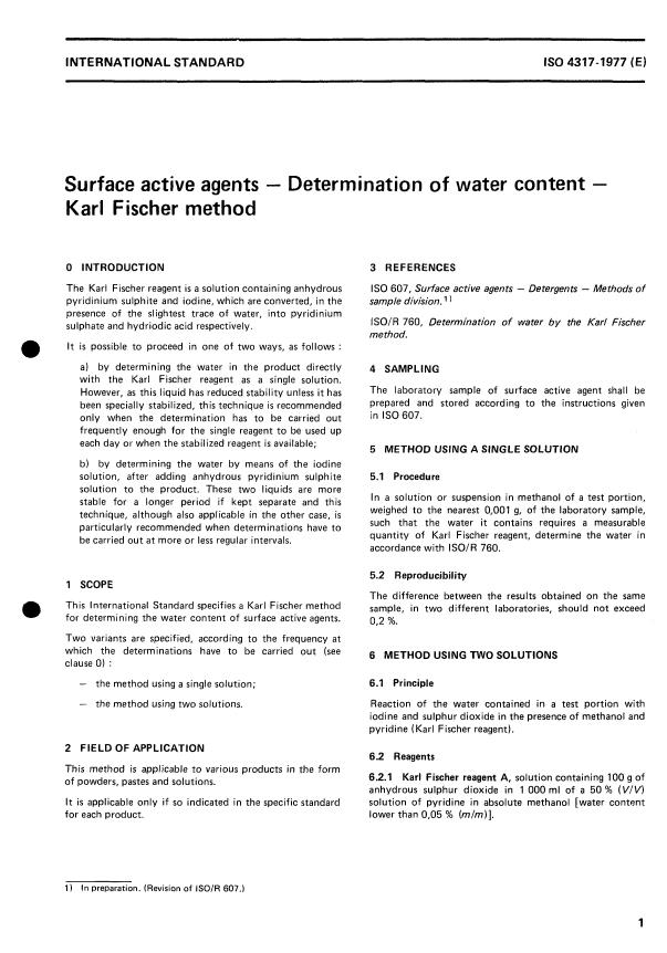 ISO 4317:1977 - Surface active agents — Determination of water content — Karl Fischer method Released:8/1/1977
