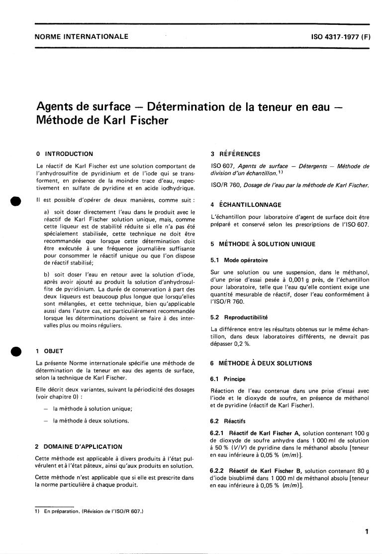 ISO/R 760, Dosage de l'eau par la méthode de Karl Fischer.