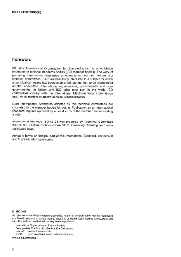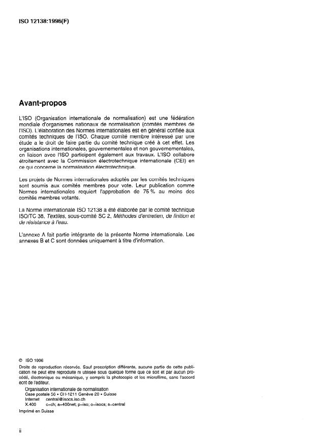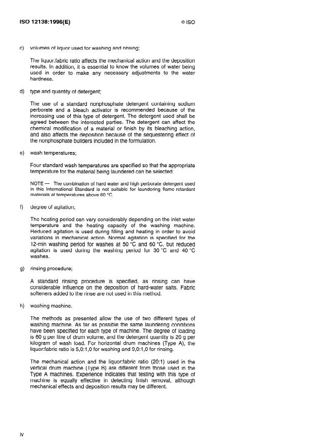 ISO 12138:1996 is a standard published by the International Organization for Standardization (ISO). Its full title is "Textiles — Domestic laundering procedures for textile fabrics prior to flammability testing". This standard covers: Describes domestic laundering procedures for repeated washing at selected wash temperatures prior to assessing flammability behaviour of textiles. The washing machines and procedures specified are based on ISO 6330.