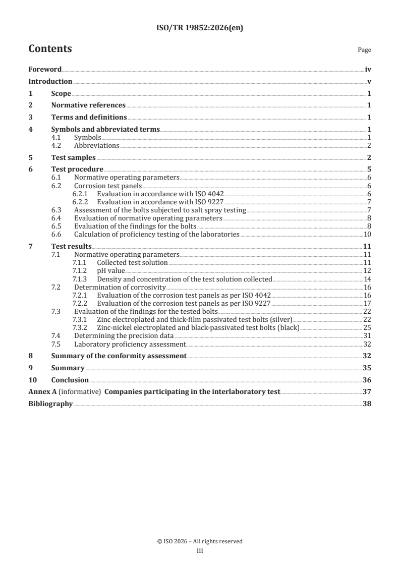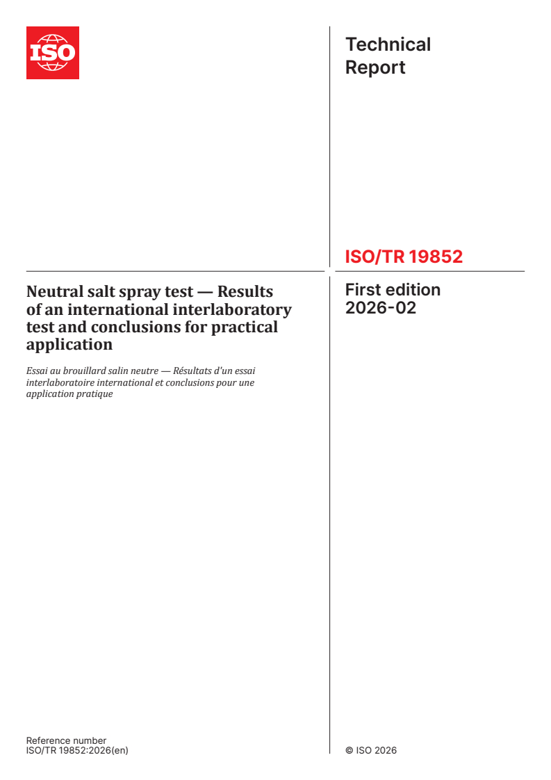 ISO/TR 19852:2026 is a technical report published by the International Organization for Standardization (ISO). Its full title is "Neutral salt spray test — Results of an international interlaboratory test and conclusions for practical application". This standard covers: The objective of this document is to conduct a neutral salt spray test in accordance with ISO 9227. The test is a proven method for assessing the corrosion protection of coatings of components such as bolts. For this reason, two coating variants were chosen for conducting the tests on hexagon bolts with a size of M6 × 50. The bolts were examined at specified points in time and the time of occurrence of grey veil, white rust and red rust was documented. The corrosivity of the salt spray was determined by means of two methods and also documented in an evaluation form. These two methods are the assessment of the mass loss of an uncoated steel panel as specified in ISO 9227 as well as the determination of the time until appearance of red rust on hot-dip galvanized steel panels in accordance with ISO 4042 and ISO 10683. The processing steps are specified in detail in a manual that was provided to the test participants. If followed precisely, these instructions allow for a comparative analysis of the results from the individual labs and make it possible to determine the reproducibility of the salt spray test. Another objective is to compare the two methods used to determine the corrosivity of the salt spray in order to establish the suitability of these methods by comparing the corrosion assessment results obtained for the bolts. In addition, the normative operating parameters (temperature in the test cabinet, collection rate, pH and density or NaCl concentration of the solution collected) were documented for every inspection date in order to ascertain whether there is any correlation with the results of the corrosion assessment performed on the bolts.