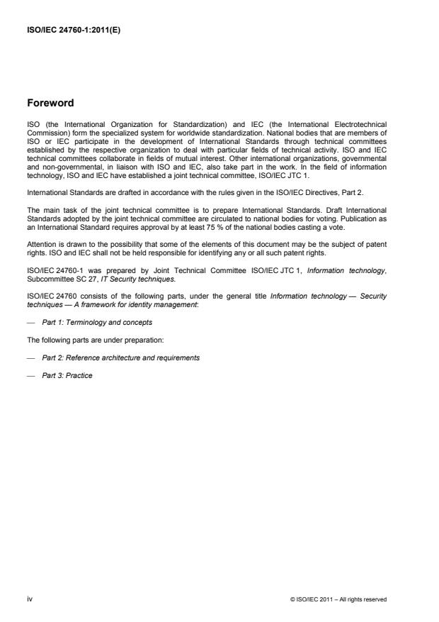 ISO/IEC 24760-1:2011 defines terms for identity management, and specifies core concepts of identity and identity management and their relationships. It is applicable to any information system that processes identity information. A bibliography of documents describing various aspects of identity information management is provided.