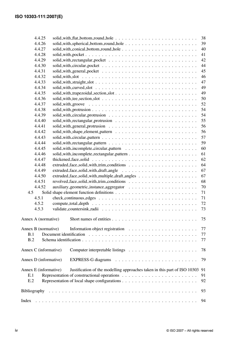 - Normative and informative annexes - include entity short names, registration information, EXPRESS-G diagrams, listings, and modelling justification.