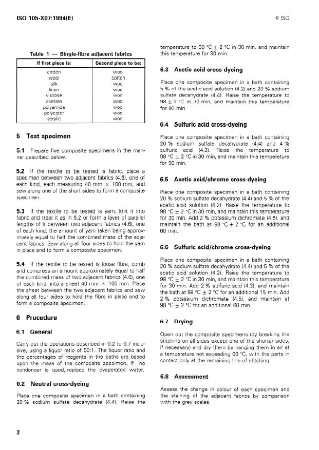 ISO 105-X07:1994 is a standard published by the International Organization for Standardization (ISO). Its full title is "Textiles - Tests for colour fastness - Part X07: Colour fastness to cross-dyeing: Wool". This standard covers: Specifies a method for determining the resistance of the colour of textiles to the action of processes used for dyeing wool. Specimens of the textile in contact with adjacent fabrics are treated in different types of wool dye-bath, but without any dyestuff. The specimens are then rinsed and dried. The change in colour of the specimen and the staining of the adjacent fabrics are assessed with the grey scales.
