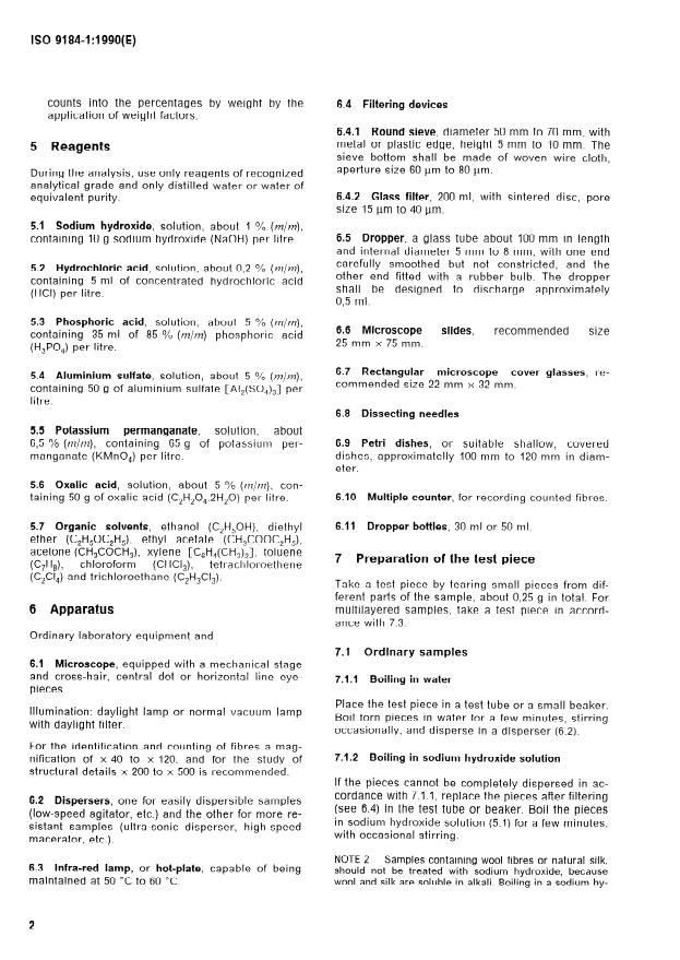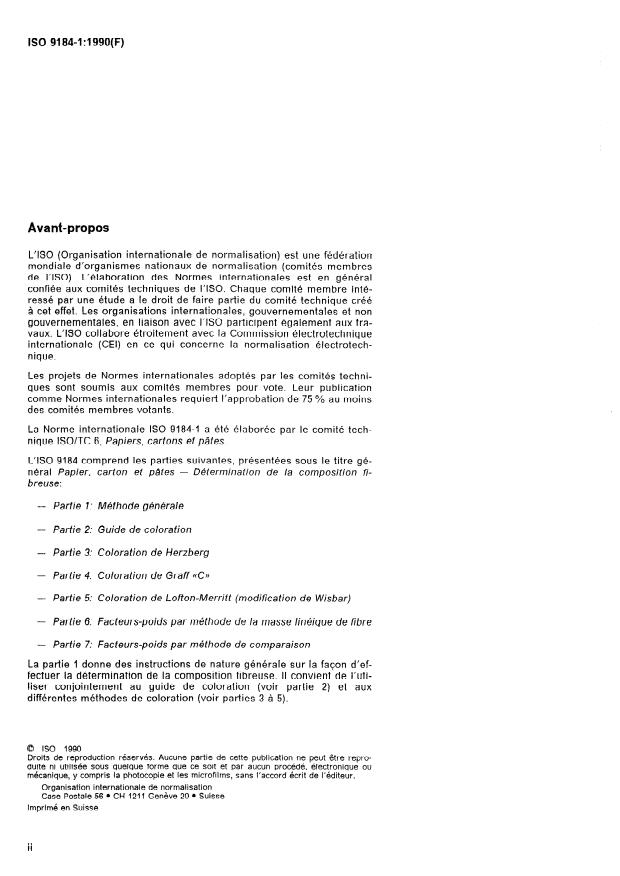 ISO 9184-1:1990 is a standard published by the International Organization for Standardization (ISO). Its full title is "Paper, board and pulps — Fibre furnish analysis — Part 1: General method". This standard covers: This part specifies the general performance of the test for fibre furnish analysis. It is applicable to all kinds of pulps and to most papers and boards, including those containing more than one kind of fibre, taking into account different pulping processes. This method is less suitable for heavily impregnated or highly coloured papers and boards. The standard describes in detail: principle, reagents, apparatus, preparation of the test piece, staining and preparation of fibre slides, test procedure, quantitative analysis, expression of results, test report.