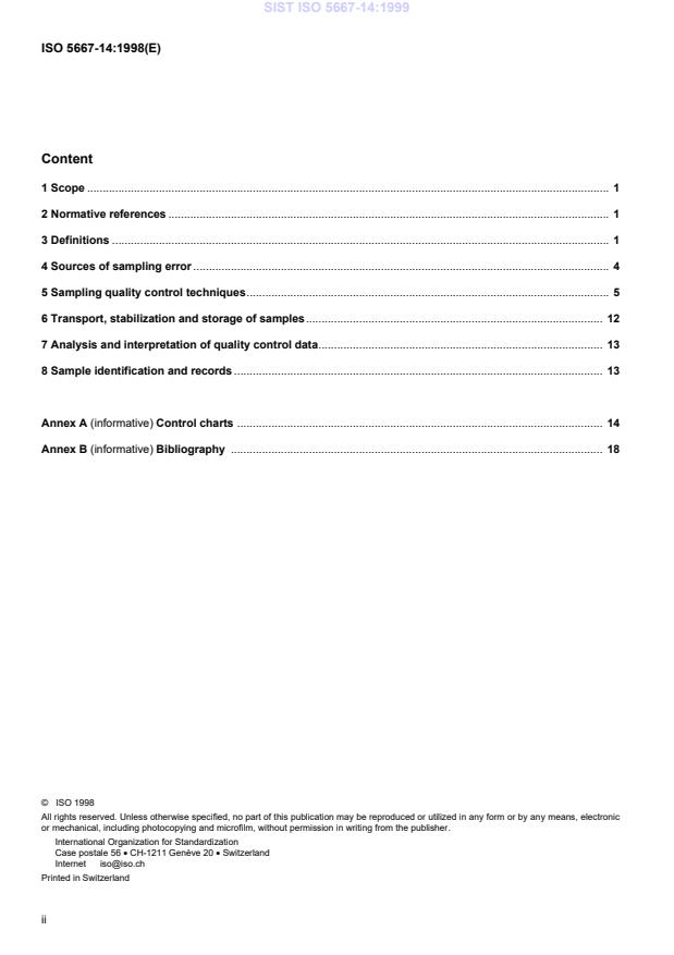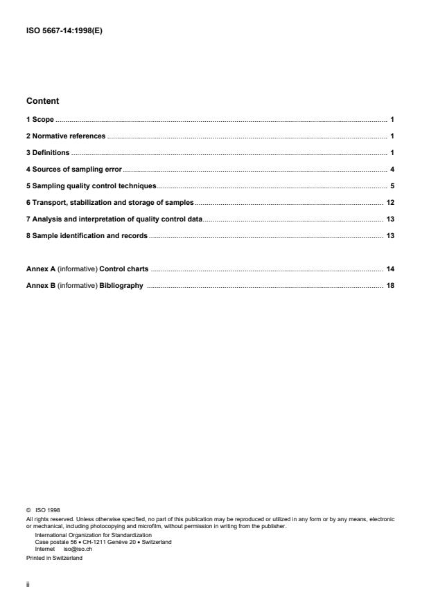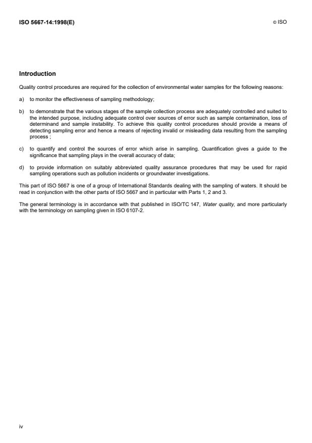 ISO 5667-14:1998 is a standard published by the International Organization for Standardization (ISO). Its full title is "Water quality — Sampling — Part 14: Guidance on quality assurance of environmental water sampling and handling". This standard covers: Water quality — Sampling — Part 14: Guidance on quality assurance of environmental water sampling and handling
