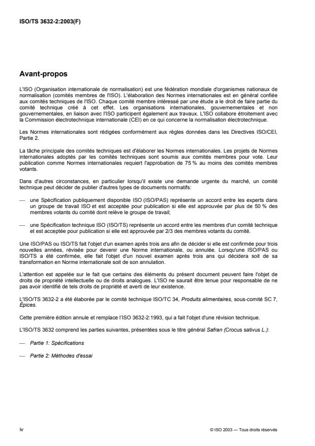 L'ISO/TS 3632-2:2003 spécifie les méthodes d'analyse du safran obtenu à partir des fleurs de Crocus sativus L. Elle est applicable au safran présenté sous l'une des formes suivantes: en filaments entiers et coupés, sous forme de masse lâche, souple élastique et hygroscopique; et en poudre.