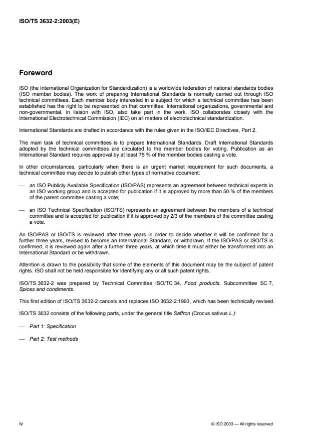 ISO/TS 3632-2:2003 is a technical specification published by the International Organization for Standardization (ISO). Its full title is "Saffron (Crocus sativus L.) — Part 2: Test methods". This standard covers: ISO/TS 3632-2:2003 specifies methods for the analysis of saffron obtained from Crocus sativus L. flowers. It is applicable to saffron in both of the following forms: whole and cut filaments as a loose, supple, elastic and hygroscopic mass of filaments; and powder.