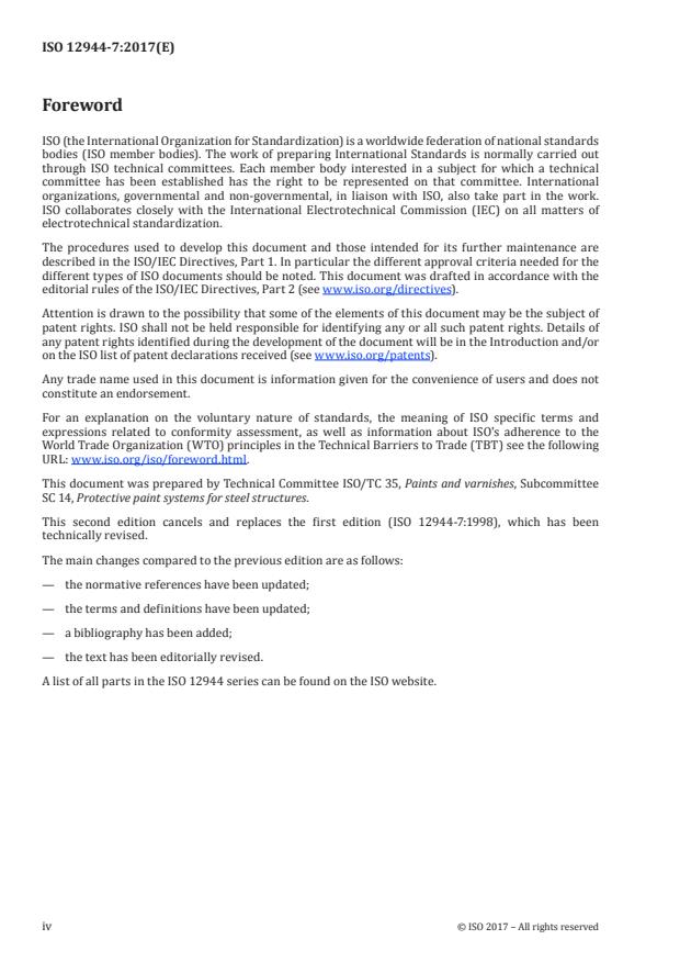 ISO 12944-7:2017 deals with the execution and supervision of paint work on steel structures in the workshop or on site. ISO 12944-7:2017 does not apply to - the preparation of surfaces to be painted (see ISO 12944‑4) and the supervision of such work, - the application of metallic coatings, and - pre-treatment methods, such as phosphating and chromating, and paint application methods, such as dipping, powder coating or coil coating.