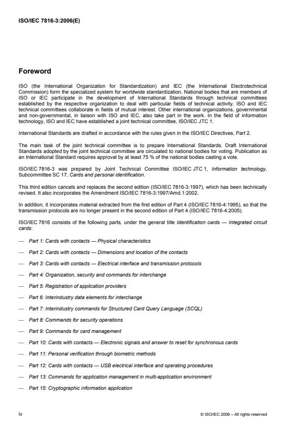 ISO/IEC 7816-3:2006 - "Identification cards - Integrated circuit cards - Part 3: Cards with contacts - Electrical interface and transmission protocols" defines the electrical interface and communication protocols for contact smart cards. The standard specifies power and signal structures, activation and reset sequences, transmission mechanisms and procedures for data exchange between an integrated circuit card and an interface device (terminal/reader). It applies to asynchronous contact cards and covers character- and block-level transmission (not the content of commands or application data).