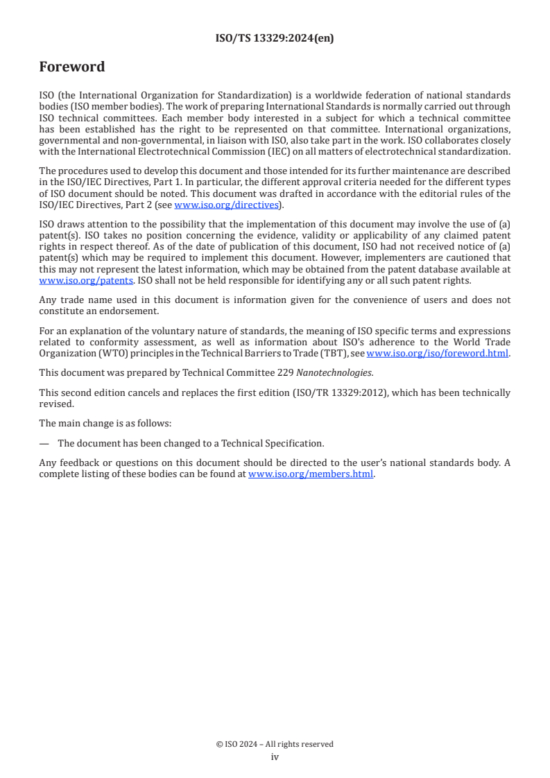 ISO/TS 13329:2024 is a technical specification published by the International Organization for Standardization (ISO). Its full title is "Nanomaterials - Preparation of safety data sheets (SDS)". This standard covers: This document provides guidance on the development of content for, and consistency in, the communication of information on safety, health and environmental matters in safety data sheets (SDS) for substances classified as manufactured nanomaterials (and materials or products that contain manufactured nanomaterials). It provides additional information on safety issues associated with manufactured nanomaterials. It provides supplemental guidance to ISO 11014 on the preparation of SDSs.