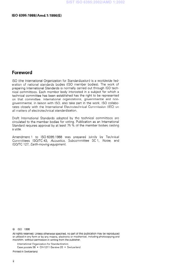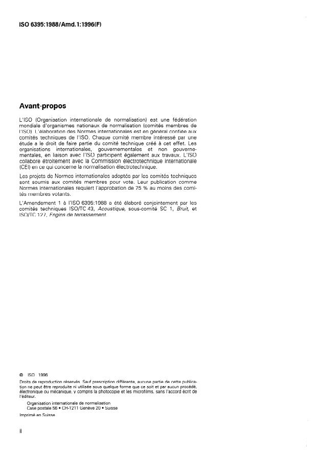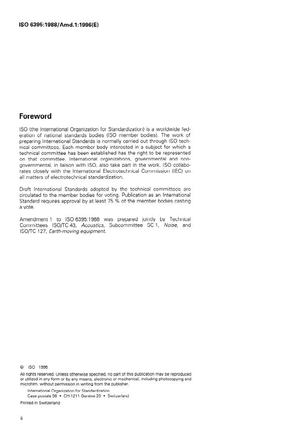 ISO 6395:1988/Amd 1:1996 is a standard published by the International Organization for Standardization (ISO). Its full title is "Acoustics — Measurement of exterior noise emitted by earth-moving machinery — Dynamic test conditions — Amendment 1". This standard covers: Contains a number of amendments regarding the wording of some clauses and adds the annex E.
