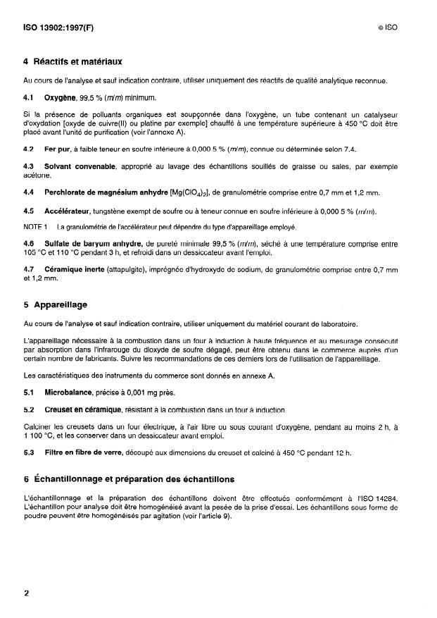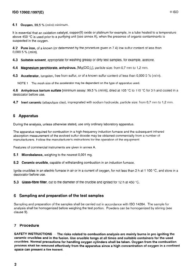 ISO 13902:1997 is a standard published by the International Organization for Standardization (ISO). Its full title is "Steel and iron — Determination of high sulfur content — Infrared absorption method after combustion in an induction furnace". This standard covers: Steel and iron — Determination of high sulfur content — Infrared absorption method after combustion in an induction furnace