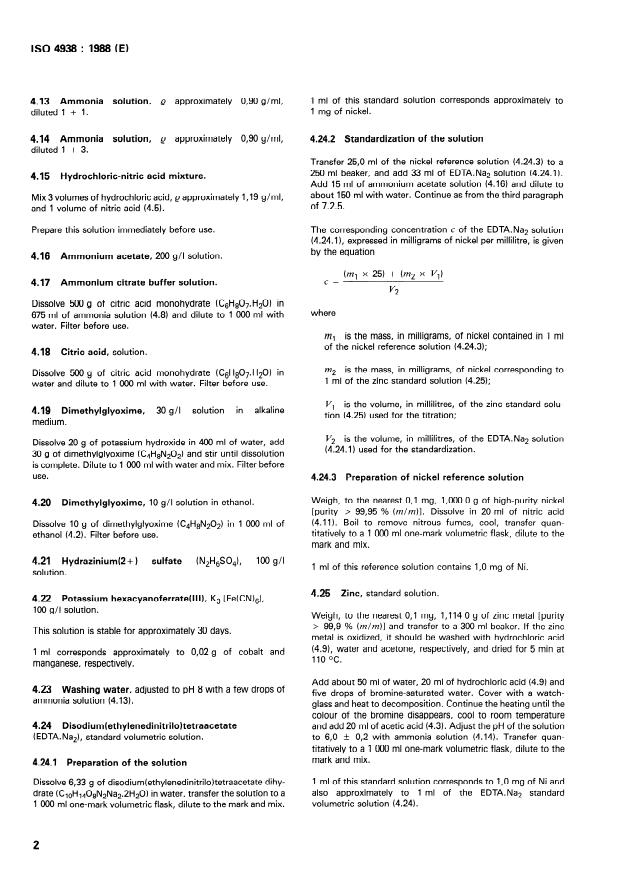 ISO 4938:1988 is a standard published by the International Organization for Standardization (ISO). Its full title is "Steel and iron — Determination of nickel content — Gravimetric or titrimetric method". This standard covers: The method is applicable to nickel contents between 0.5 % (m/m) and 30 % (m/m). Specifies principle, reagents, apparatus, sampling, procedure, expression of results and test report. Annex A gives additional information on the international co-operative tests, and Annex B represents the precision data graphically.