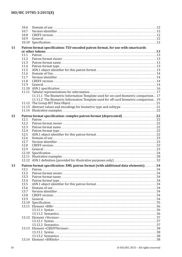 ISO/IEC 19785-3:2015 is a standard published by the International Organization for Standardization (ISO). Its full title is "Information technology — Common Biometric Exchange Formats Framework — Part 3: Patron format specifications". This standard covers: ISO/IEC 19785-3:2015 specifies and publishes registered CBEFF patron formats (see ISO/IEC 19785‑1) defined by the CBEFF patron ISO/IEC JTC 1/SC 37, and specifies their registered CBEFF patron format types (see ISO/IEC 19785‑2) and resulting full ASN.1 Object Identifiers.