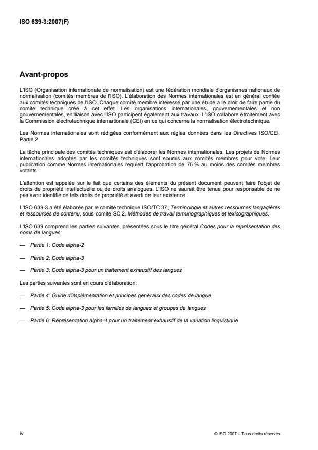 L'ISO 639-3:2007 fournit un code, publié par l'Agence d'enregistrement de l'ISO 639-3, composé de codets de langue formés avec des indicatifs de langue à trois lettres pour la représentation des langues. Les indicatifs de langue de l'ISO 639-3:2007 ont été conçus pour être utilisés dans une large gamme d'applications, en particulier dans les systèmes informatiques, lorsqu'il y a un besoin potentiel de prise en charge du grand nombre de langues dont l'existence est connue. Alors que l'ISO 639-1 et l'ISO 639-2 se focalisent sur les grandes langues du monde les plus fréquemment représentées dans le corpus de la littérature mondiale, l'ISO 639-3:2007 vise à fournir une énumération de langues la plus complète possible, y compris les langues vivantes, les langues mortes, les langues anciennes et les langues construites artificiellement, qu'elles soient majeures ou mineures, écrites ou orales. Par conséquent, l'ISO 639-3:2007 traite d'un très grand nombre de langues moins connues. Les langages créés pour être exclusivement utilisés dans des machines, comme les langages de programmation, ainsi que les langues reconstituées ne sont pas inclus dans le présent code.