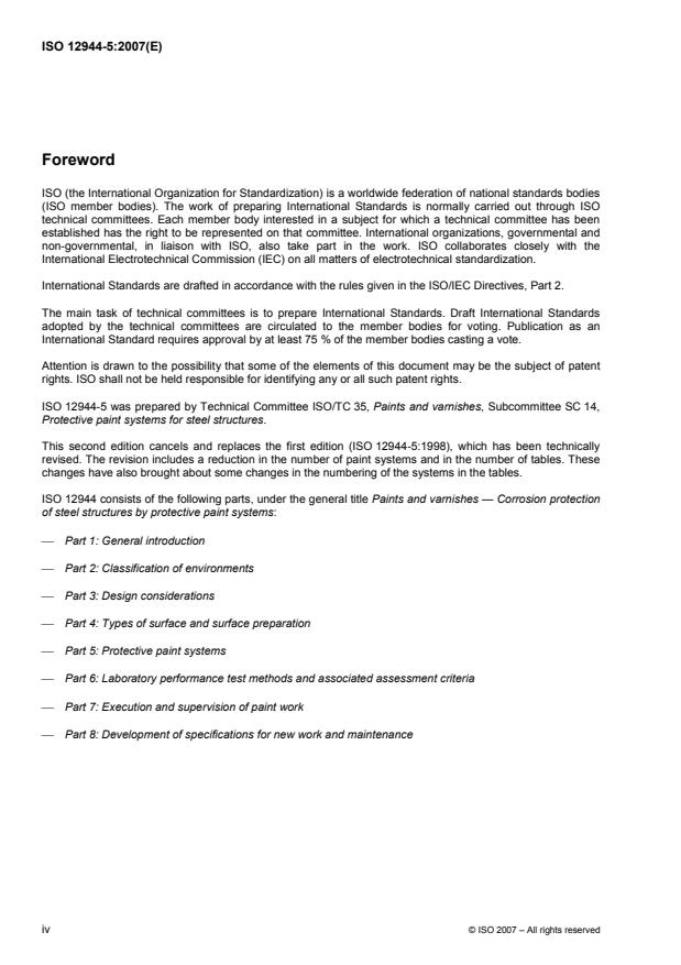 ISO 12944-5:2007 is a standard published by the International Organization for Standardization (ISO). Its full title is "Paints and varnishes — Corrosion protection of steel structures by protective paint systems — Part 5: Protective paint systems". This standard covers: ISO 12944-5:2007 describes the types of paint and paint system commonly used for corrosion protection of steel structures. It also provides guidance for the selection of paint systems available for different environments and different surface preparation grades, and the durability grade to be expected. The durability of paint systems is classified in terms of low, medium and high.