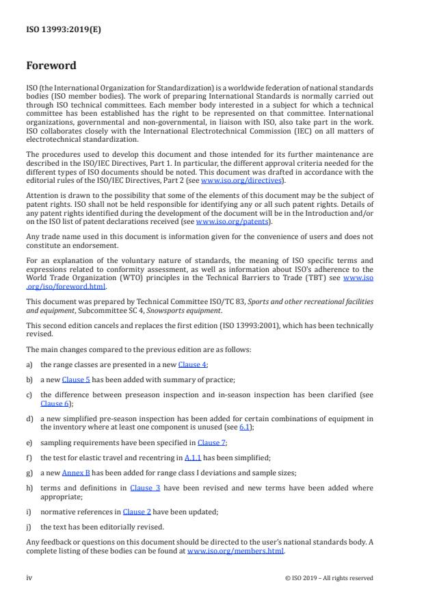 ISO 13993:2019 is a standard published by the International Organization for Standardization (ISO). Its full title is "Rental ski shop practice — Sampling and inspection of complete and incomplete alpine ski-binding-boot systems in rental applications". This standard covers: This document specifies a uniform method for the sampling and inspection of complete and incomplete alpine ski-binding-boot systems used in rental operations. This document is intended for any facility which rents complete and incomplete alpine ski-binding-boot systems as for example when the skier owns the boots. This document is not applicable for alpine touring ski-binding-boot systems. This document is not applicable for complete and incomplete alpine ski-binding-boot systems which are rented for 15 days or more. NOTE 1 A period of less than 15 days is common for equipment being rented. NOTE 2 ISO 11088 gives a method for testing if the equipment is owned or rented for 15 days or more.